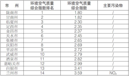 9月份,全省14個城市環(huán)境空氣質量綜合排名由好到差分別為:隴南、甘南、臨夏、定西、金昌、天水、張掖、慶陽、平涼、武威、酒泉、嘉峪關、白銀、蘭州。