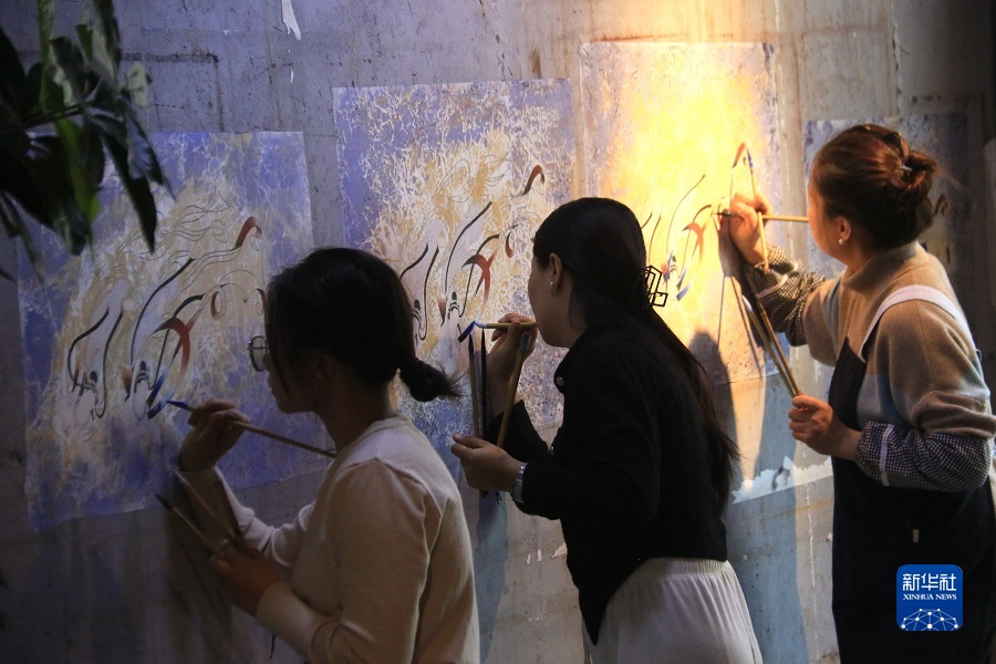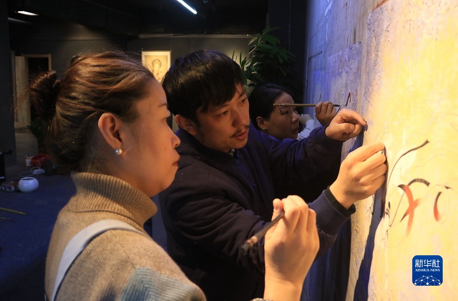 2月22日,在敦煌小鎮(zhèn)鳴沙書院,藝術(shù)工作者張杰龍(中)指導學員臨摹敦煌壁畫。