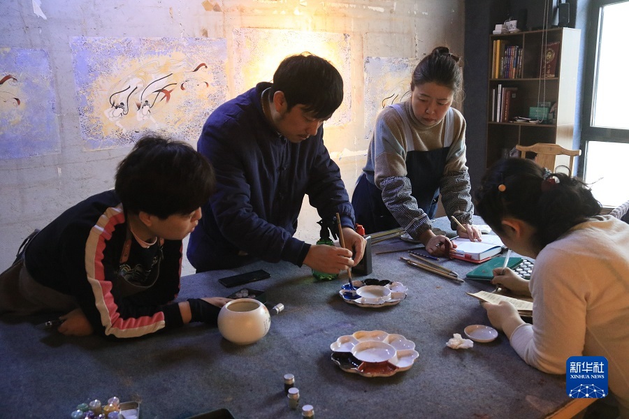 2月22日,在敦煌小鎮(zhèn)鳴沙書院,藝術(shù)工作者張杰龍(中)指導學員進行顏料調(diào)色。