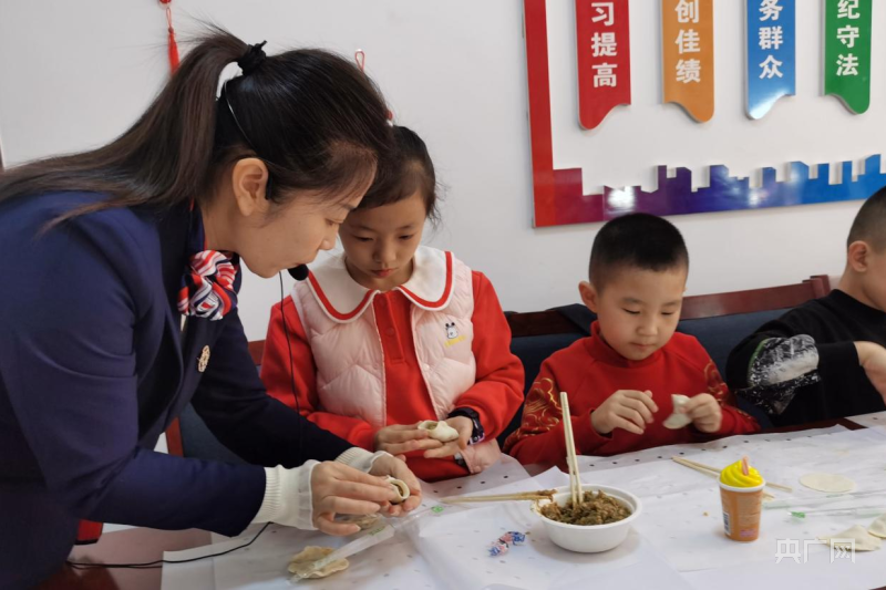 孩子們聽老師講傳統(tǒng)習(xí)俗體驗包餃子(央廣網(wǎng)發(fā) 唐欣 攝)