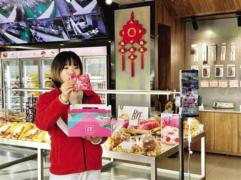 “第一次走進(jìn)直播間的粉絲一定要入手玫瑰禮餅,它是采用蘭州苦水玫瑰制作的……”每天上午,位于九州中路的愛禮烘焙生活工廠店內(nèi)一角,工作人員都在直播售貨。剛走進(jìn)店里就能聞到撲鼻而來的糕點香味,琳瑯滿目的商品讓人應(yīng)接不暇。