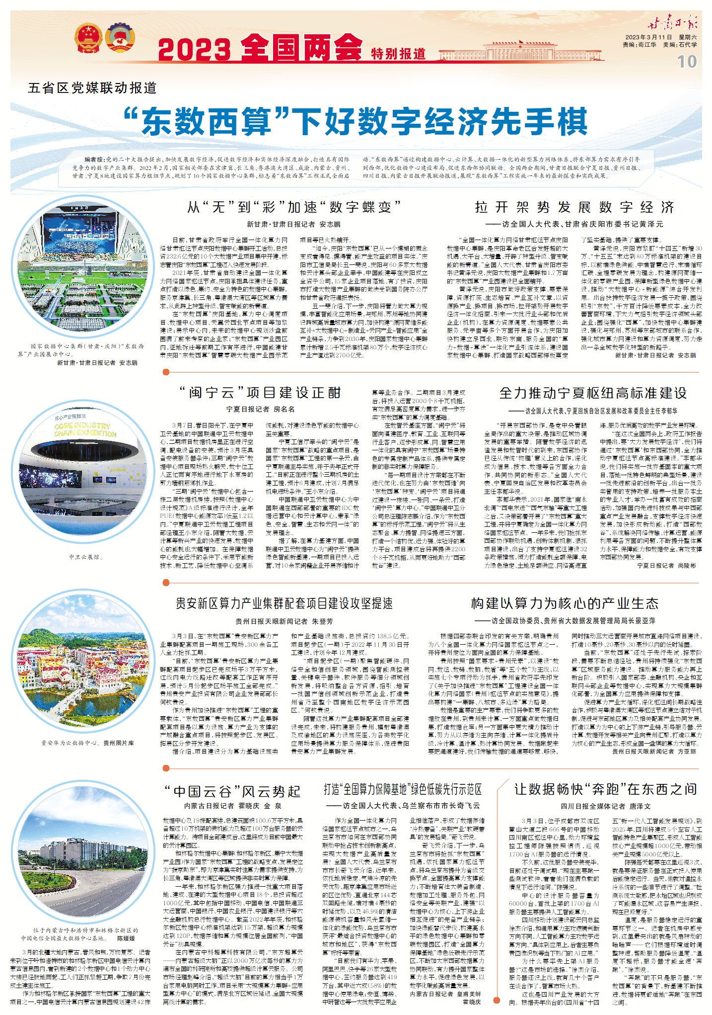編者按:黨的二十大報(bào)告提出,加快發(fā)展數(shù)字經(jīng)濟(jì),促進(jìn)數(shù)字經(jīng)濟(jì)和實(shí)體經(jīng)濟(jì)深度融合,打造具有國際競爭力的數(shù)字產(chǎn)業(yè)集群。2022年2月,國家相關(guān)部委在京津冀、長三角、粵港澳大灣區(qū)、成渝、內(nèi)蒙古、貴州、甘肅、寧夏8地建設(shè)國家算力樞紐節(jié)點(diǎn),規(guī)劃了10個(gè)國家數(shù)據(jù)中心集群,標(biāo)志著“東數(shù)西算”工程正式全面啟動(dòng)。“東數(shù)西算”通過構(gòu)建數(shù)據(jù)中心、云計(jì)算、大數(shù)據(jù)一體化的新型算力網(wǎng)絡(luò)體系,將東部算力需求有序引導(dǎo)到西部,優(yōu)化數(shù)據(jù)中心建設(shè)布局、促進(jìn)東西部協(xié)同聯(lián)動(dòng)。全國兩會(huì)期間,甘肅日報(bào)聯(lián)合寧夏日報(bào)、貴州日報(bào)、四川日報(bào)、內(nèi)蒙古日報(bào)開展聯(lián)動(dòng)報(bào)道,展現(xiàn)“東數(shù)西算”工程實(shí)施一年來的最新探索和實(shí)踐成果。