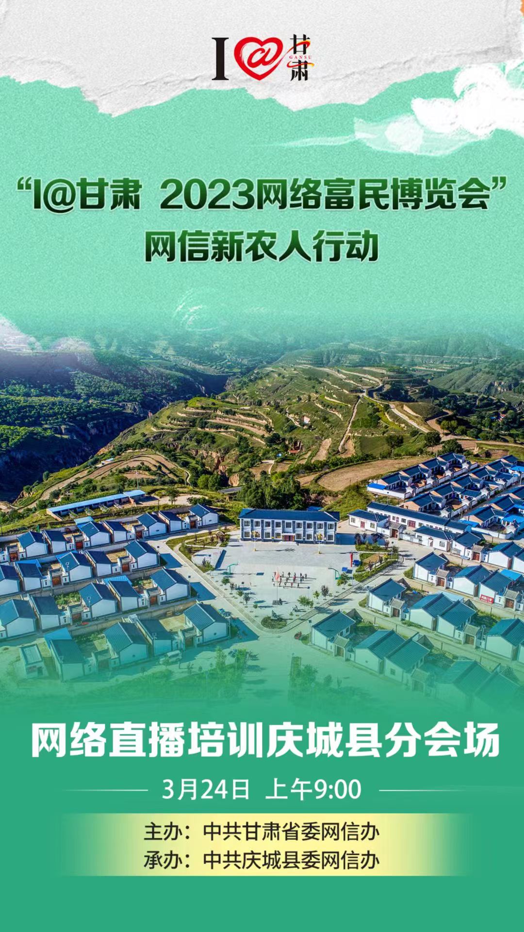 甘肅省委網(wǎng)信辦“I@甘肅 2023網(wǎng)絡(luò)網(wǎng)絡(luò)富民博覽會”網(wǎng)信新農(nóng)人行動第4場網(wǎng)絡(luò)主播培訓(xùn)班,將于3月24日在慶陽市慶城縣舉辦