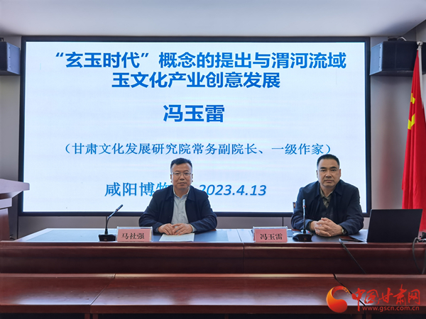 中國甘肅網(wǎng)4月13日訊 為進(jìn)一步促進(jìn)博物館學(xué)術(shù)研究交流創(chuàng)新,激發(fā)博物館發(fā)展活力,持續(xù)推動博物館高質(zhì)量發(fā)展,陜西咸陽博物院于4月13日下午3點舉辦第二期“咸博大講堂”專題講座,甘肅文化發(fā)展研究院常務(wù)副院長、一級作家馮玉雷作了題為《“玄玉時代”概念的提出與渭河流域玉文化產(chǎn)業(yè)創(chuàng)意發(fā)展》的學(xué)術(shù)報告。咸陽博物院院長馬社強(qiáng)主持講座。