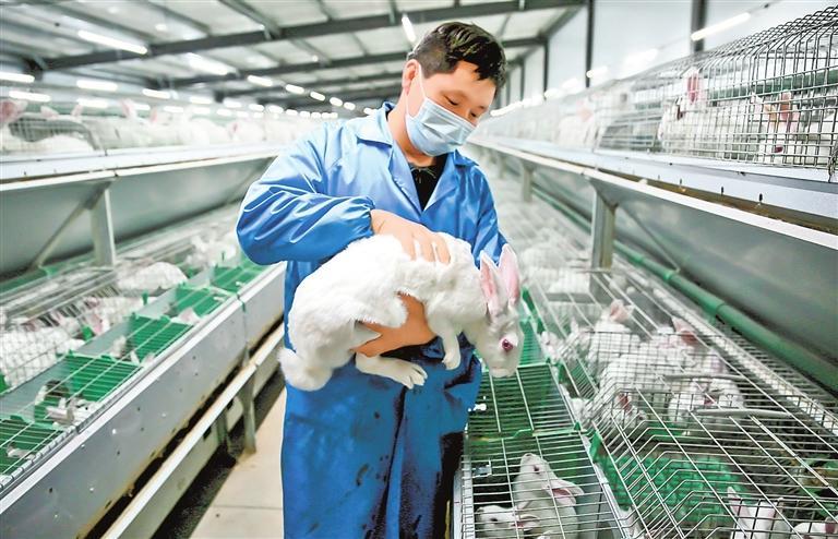 在武都區(qū)坪埡易地扶貧搬遷后續(xù)產(chǎn)業(yè)示范園里,康大肉兔養(yǎng)殖場(chǎng)的工人檢查肉兔生長(zhǎng)情況