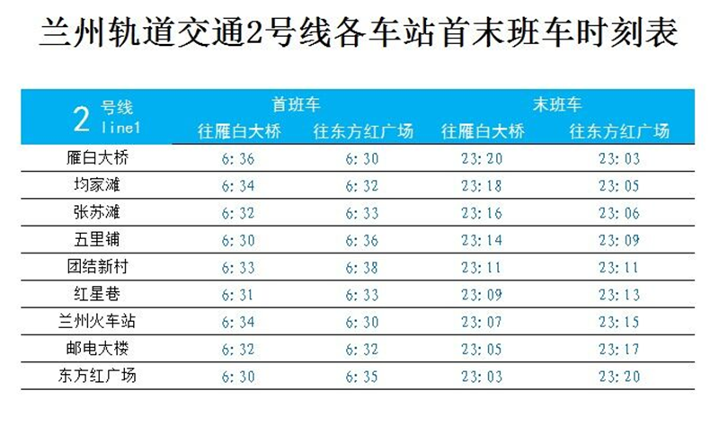另?yè)?jù)了解,蘭州軌道交通2號(hào)線一期工程初期運(yùn)營(yíng)時(shí)間為6:30至23:20,每天運(yùn)營(yíng)服務(wù)16小時(shí)50分鐘,運(yùn)行列車最小行車間隔6分20秒,最大行車間隔8分40秒,全線單程運(yùn)行平均時(shí)間約15分鐘53秒。