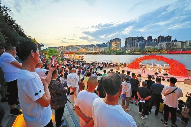 19日,游客在黃河岸邊欣賞黃河之濱百日千場(chǎng)音樂(lè)展演活動(dòng)。新華社照片