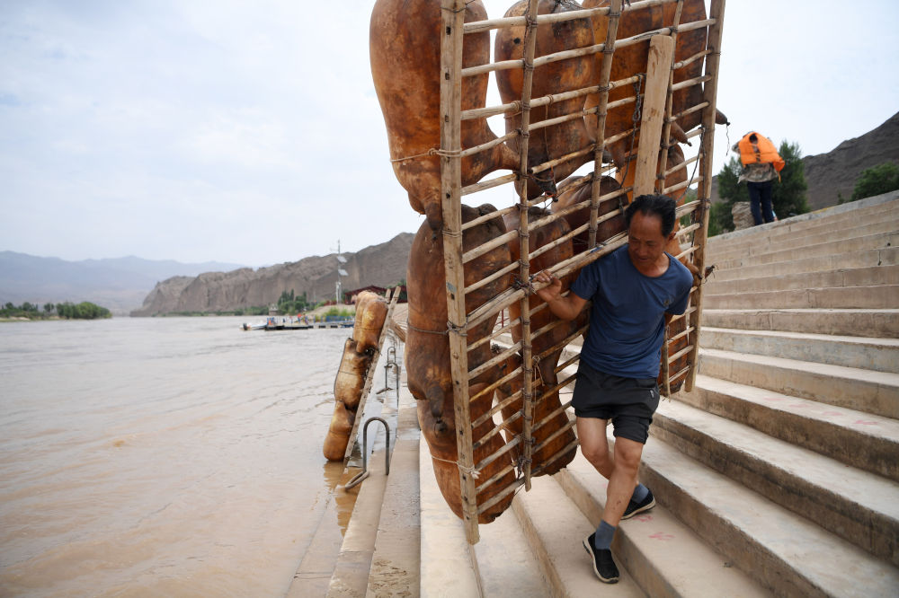 一名筏子客在黃河石林景區(qū)背著羊皮筏子準備漂流(7月11日攝)。新華社記者 陳斌 攝
