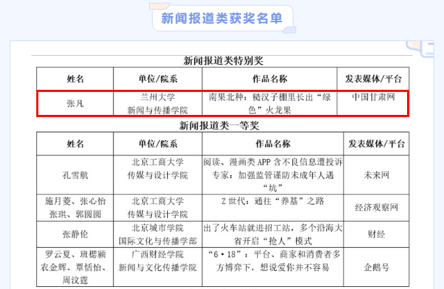 蘭州大學(xué)新聞與傳播學(xué)院獲獎中,張凡的作品《南果北種!糙漢子棚里種出“綠色”火龍果》在中國甘肅網(wǎng)刊發(fā),系蘭州大學(xué)新聞與傳播學(xué)院、中國甘肅網(wǎng)聯(lián)合舉辦的第十三屆“重走中國西北角”接力采訪活動新聞作品。