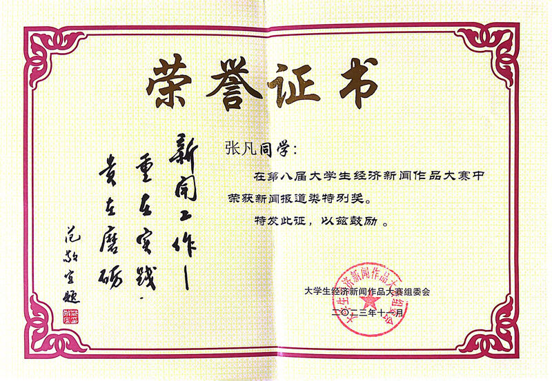 張凡獲獎榮譽(yù)證書