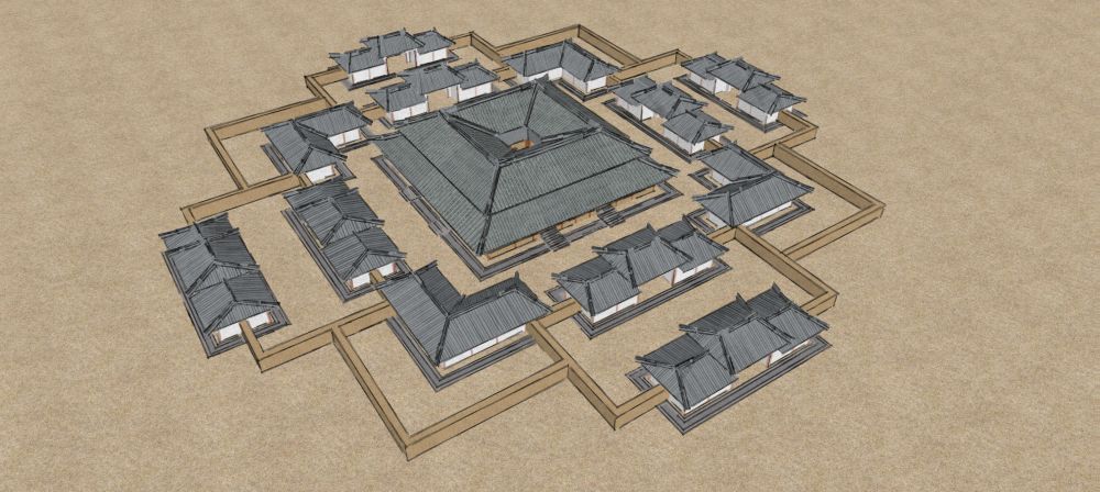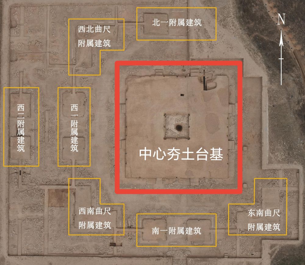 遺址結(jié)構(gòu)清晰——以中心夯土臺(tái)基為中心,東西南北各有兩組并行對(duì)稱的長方形附屬建筑,四角分布曲尺形附屬建筑。殘留建筑遺跡面積近9000平方米。
