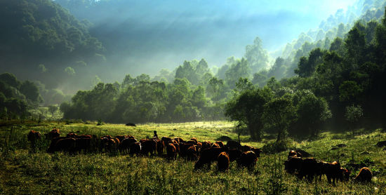 同樣是在天水市的張家川,關山,那列人文印痕飽滿的山脈像一條綠絲帶在我們面前展現(xiàn)著無盡的美麗,只是在張家川境內,它的旋律卻像是被擰緊的琴弦發(fā)出的,凝結,突兀,而在相鄰的陜西省隴縣,它才盡情地展示著牧場的魅力,每一處峰巒山頂上還是一片林子,到了山腰卻變成了美麗的草甸,遍布牛馬。