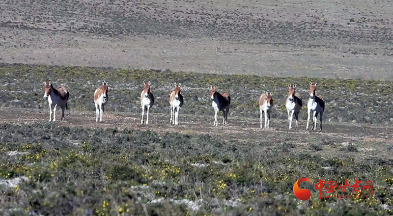 畫面顯示,此次拍攝到藏野驢共10頭,它們覓食歸來(lái),時(shí)而排成一排,悠閑地看著眼前的陌生來(lái)客,時(shí)而奔跑,馳騁在廣袤的草原之上。