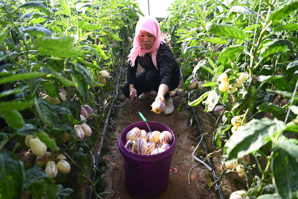 在古浪縣干城鄉(xiāng)富民新村日光溫室大棚內,村民采摘人參果。新華社記者范培珅攝