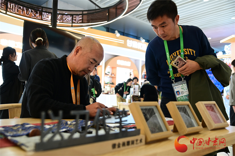 展廳里,除了靜態(tài)展示的鍥金畫,還有手工藝人現(xiàn)場演示刻刀的用法——觀眾能看著鋼刀在底板上游走,看線條一點(diǎn)點(diǎn)成型,感受每一刀背后的細(xì)致與耐心。旁邊的VR體驗(yàn)區(qū),通過折幕投影帶觀眾“走進(jìn)”莫高窟,也讓大家更懂張兆武筆下敦煌元素的由來;“美食薈”里的蘭州牛肉面、“文藝薈”里的特色工藝,則從旁襯托著這門非遺手藝的文化底色。