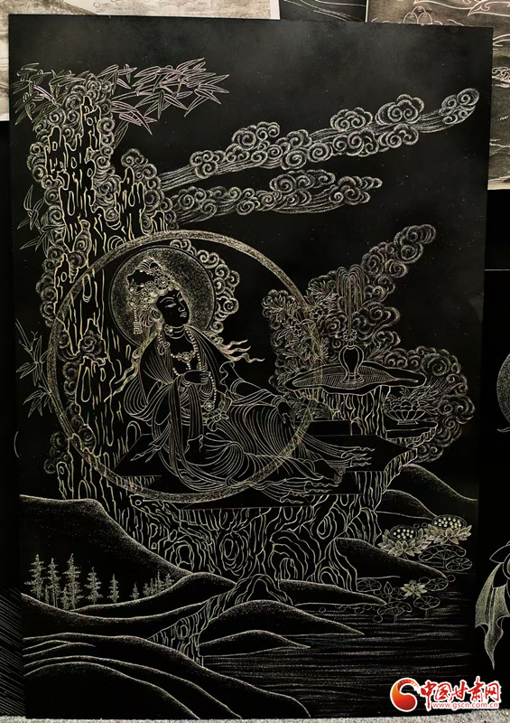 對張兆武來說,做鍥金畫從來不是“照貓畫虎”。他琢磨傳統(tǒng)書畫的筆墨、篆刻的力道,慢慢攢出了自己的一套刀法;創(chuàng)作時(shí),心里裝的也全是敦煌——從莫高窟第112窟里“反彈琵琶”的靈動舞姿,到傳說中“九色神鹿”的溫潤模樣,都成了他刻刀下的主角。他刻出的飛天,飄帶像帶著風(fēng);刻出的菩薩,眉眼間透著莊重;金屬的光澤在畫面上流轉(zhuǎn),明明是靜態(tài)的畫,卻像在講一段活的敦煌故事。“不用多說什么,看過的人能懂這份美。”張兆武說的這份“懂”,恰恰打破了文化和語言的距離,讓東方的古老美學(xué),和全世界的現(xiàn)代審美碰出了共鳴。