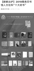 “商務(wù)印書館人文社科好書評(píng)選”被中央電視臺(tái)等媒體稱為“年度圖書榜單風(fēng)向標(biāo)”。每每公布后,央媒及主流媒體都會(huì)予以報(bào)道,同時(shí)在新媒體平臺(tái)也會(huì)進(jìn)行系列宣傳,比如2019年的好書評(píng)選人民日?qǐng)?bào)官方微信發(fā)布后一天內(nèi)的閱讀量便超過了888萬。