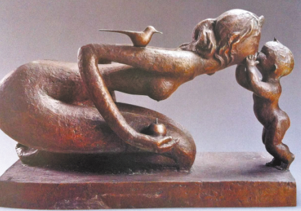 最后的廳,是一批中外馳名的雕塑代表作——從嬌小稚拙掌中把玩的小品到體量龐大高聳入云的巨構(gòu),無論隨形寫意、裝飾寫實,美林都在策劃、構(gòu)成、調(diào)整、定型的繁復(fù)過程中,顯示出扎實的藝術(shù)功力與非凡的浪漫色彩。其中,龍、虎、馬、牛等動物系列,不僅延續(xù)了繪畫中獨有的造型風(fēng)格,而且更凝重渾厚,更富裝飾情趣。與眾不同人見人愛的母子系列中,不論是精心呵護襁褓嬰兒的母親,匍匐草地引領(lǐng)學(xué)步的母親,牽手寶寶步入校園的母親,造型、肢體的夸張之奇變形之巧,感官、神態(tài)的風(fēng)韻依依顧盼有情,讓人駐足良久再三流連……