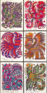 動物系列繪畫,從扎實而靈動的速寫與設(shè)計稿直至近似完美的正式作品,都蘊含了畫家捕捉物象的執(zhí)著與機敏,提煉造型的睿智與不懈,有了心血與摯愛的投入,那成竹在胸別具一格的小貓小狗小豬小鵝小猴也就躍然紙上呼之欲出了。在長方形的深色卡紙上,那銀色勾勒的活靈活現(xiàn)的百魚圖,讓我們沉醉于湛藍的海洋世界;在四方形的白色鏡框中,那七彩斑斕的百雞圖,讓我們迷戀于鄉(xiāng)間的濃郁風(fēng)情;還有鞠躬盡瘁一生奉獻膂力雄強的牛群系列,馳騁千里挾帶雄風(fēng)英姿勃勃的駿馬圖騰……