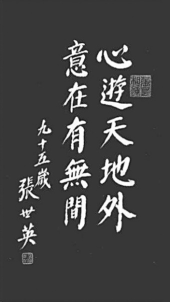 張先生的人生是圓滿的。趙樸初《遺囑》說(shuō):“生固欣然,死亦無(wú)憾。花落還開(kāi),水流不斷。我兮何有,誰(shuí)歟安息?明月清風(fēng),不勞尋覓。”弘一法師《辭世二偈》之二說(shuō):“華枝春滿,天心月圓。”這些遺言,都顯示了一種人生圓滿的喜悅。張先生書(shū)法集中的兩句話:“心游天地外,意在有無(wú)間。”同樣顯示了一種人生圓滿的喜悅。