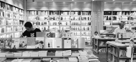 9:00,書店開始營業(yè)。走進書店,看到店內(nèi)裝修色調(diào)溫和,視野開闊,藏書豐富。臨門迎接讀者的是位于正中央的圓形桌臺,上陳列各類精品圖書,擺放造型精美,儀式感十足。沿著桌臺外圍是一圈白色座位,可供讀者坐下閱讀。