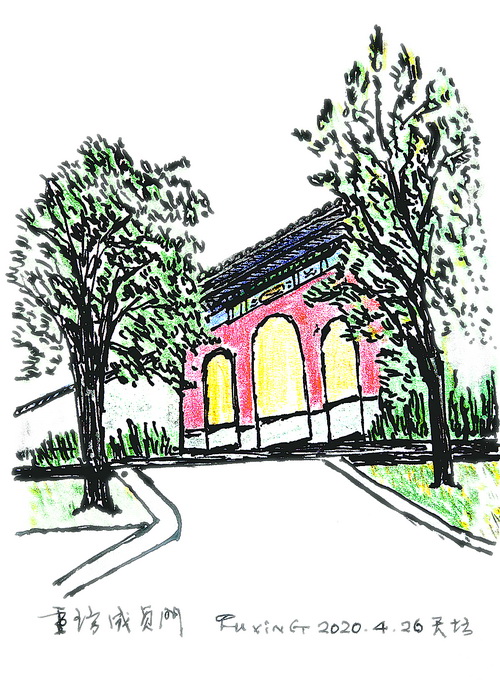 書已寫罷,小寒節(jié)氣過后,我又多次去天壇,不為寫作,只是習慣,仿佛腳步慣性,去天壇轉轉,就會感覺充實一些。2020年1月20日正值大寒節(jié)氣,那天下午,我從圜丘到成貞門西北側,那里并排有兩把座椅,我坐在座椅上畫成貞門。春節(jié)將近,除了工人在懸掛紅燈籠、安裝慶祝春節(jié)的展牌,天壇里的游人并不多。我和很多游人一樣,不知道,或者說不敏感,一場疫情正如餓虎撲食那樣向我們迫近。