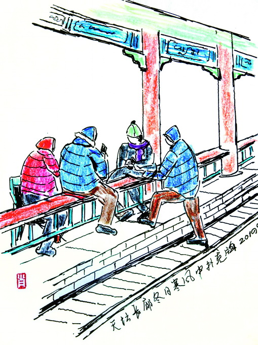 真的,如果不是畫畫,只是在那里坐著,不會有人和你搭訕。據(jù)說有人曾經(jīng)創(chuàng)造了一個“城市最強悍邏輯”的理論,雖然有幾千萬人和你在同一座城市,與你發(fā)生聯(lián)系的,只有那么幾個、幾十個。遠離現(xiàn)代城市的喧囂漩渦,在古老的天壇,卻可以創(chuàng)造這樣的奇跡——讓你與更多人發(fā)生聯(lián)系。雖然是萍水相逢,但就是這些素不相識的人,最能敞開心扉,沒有負擔地說說心里話,甚至透露一下心底的秘密。如果讓我也創(chuàng)造一個城市邏輯的話,或許可以叫“城市萍水相逢邏輯”,在這個邏輯中,可以讓完全陌生變?yōu)橐老≡?,讓擦肩而過變?yōu)閮A心交談,讓潛藏心底的如水草般搖曳纏裹的秘密,變?yōu)楦〕鏊婢`放的睡蓮。天壇讓人們被瑣碎生活揉搓得皺巴巴的心,變得如花般盛放、如天空般爽朗。