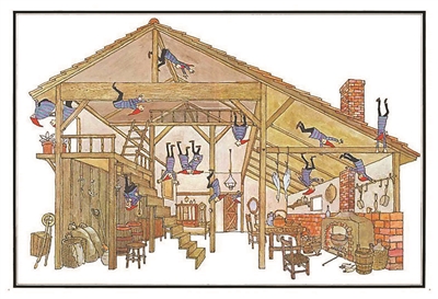 小時(shí)候的安野光雅常常把鏡子擺在地板或榻榻米上往里面看——在那個(gè)世界里,一切都被倒置了,“鏡子里出現(xiàn)了地下室,天花板變成了地板,燈泡直立在地板上。雖然知道那只是映像,但只要我愿意,地下室就能隨時(shí)出現(xiàn)在眼前”。安野光雅說,他迷戀在數(shù)學(xué)和哲學(xué)的領(lǐng)域中構(gòu)筑一個(gè)世界的感覺, “那是一個(gè)立足于現(xiàn)實(shí)的虛擬世界,可以想象,如果虛構(gòu)成真,事情會(huì)如何發(fā)展”。