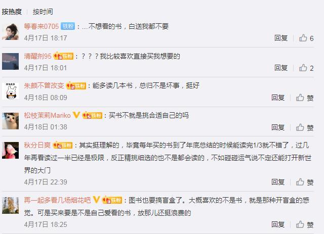此前,部分網(wǎng)友在中新經(jīng)緯微博評論對“圖書盲盒”現(xiàn)象開展討論。有網(wǎng)友提到,“其實挺理解的,畢竟每年買的書到了年底總結(jié)的時候能讀完1/3就不錯了,過幾年再看讀過一半已經(jīng)是極限,反正精挑細(xì)選的也不是都會讀的,不如碰碰運(yùn)氣說不定還能打開新世界的大門。”也有網(wǎng)友認(rèn)為,“不想看的書,白送我都不要”“買書不就是挑合適自己的嗎”等等。