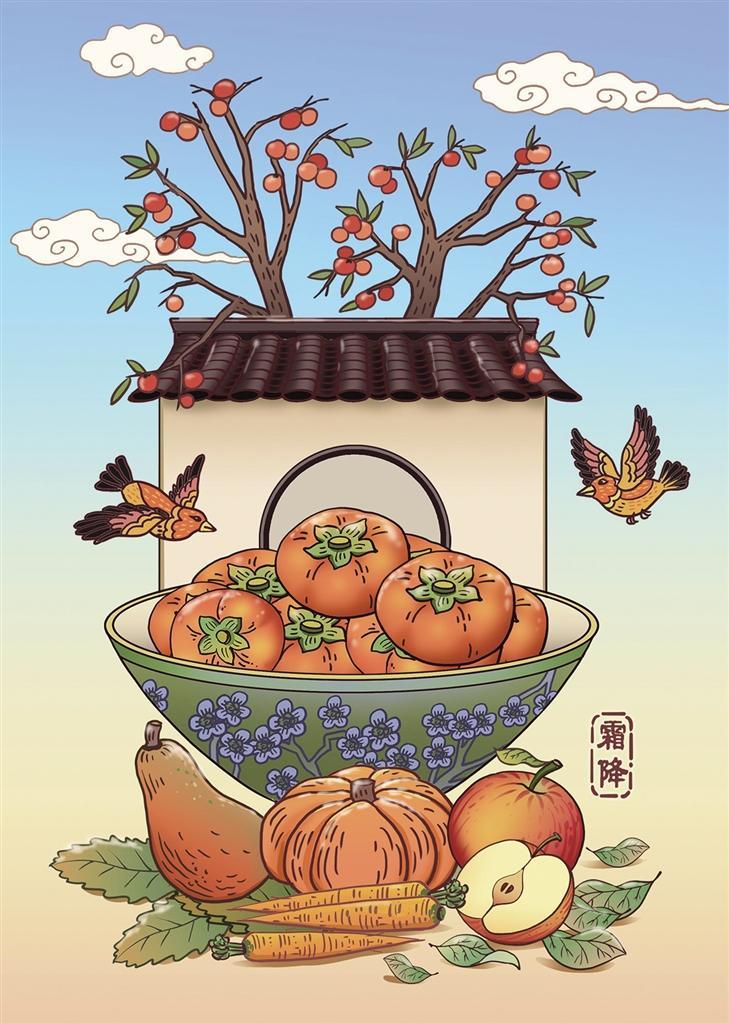 “每年10月23日前后為霜降,這是隸屬秋季的最后一個(gè)節(jié)氣。”據(jù)中國(guó)氣象局氣象服務(wù)首席專家、中央電視臺(tái)《天氣預(yù)報(bào)》節(jié)目主持人宋英杰介紹:“秋時(shí)已,亦稱秋(miao,樹梢)秋,即將畫上句號(hào)。秋日素秋,風(fēng)日謝風(fēng),辰日霜辰,草日衰草,木日疏木。‘氣肅而霜降,陰始凝也’,水汽凝華為白色冰晶。”