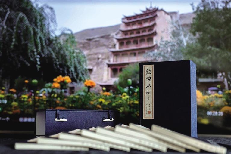 兩個(gè)月后,我如愿以償?!抖鼗捅炯o(jì)》繁體線裝本(限量版)出品,兩函,每函八冊,總計(jì)十六冊,繁體豎排,全手工裝訂。技藝之美,工序之繁,裝幀之考究,未之見過!當(dāng)我打開拿到手上時(shí)肅然起敬,自然會靜下來,恭恭敬敬翻閱,你能感受到甘肅豐富的歷史文化資源、厚重的文化積淀和波瀾壯闊的滄桑巨變。正是偉大的藝術(shù)和同樣偉大的宗教,在敦煌建筑了人類精神的輝煌莫高窟,人們生活在其中,才擁有現(xiàn)實(shí)人生意義的充實(shí)感和踏實(shí)感。
