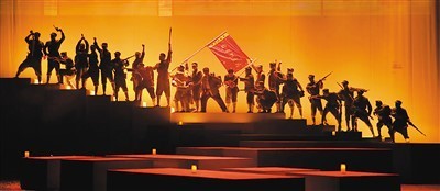 類似這樣耐人尋味、畫龍點(diǎn)睛的改編還有許多,比如原著中的“小彭”變成了“小火柴”,代表了點(diǎn)燃的微火和一種希望;“答答滴滴滴,滴滴滴答答”不僅是符號化的電碼,而且成為了最好的祝福,一句臺(tái)詞蘊(yùn)含多層含義,滿含深情。從“最后的電波”到“鐵流東進(jìn)”,更展現(xiàn)了一種大歷史觀、大時(shí)代觀,真正符合立體的舞臺(tái)呈現(xiàn)。