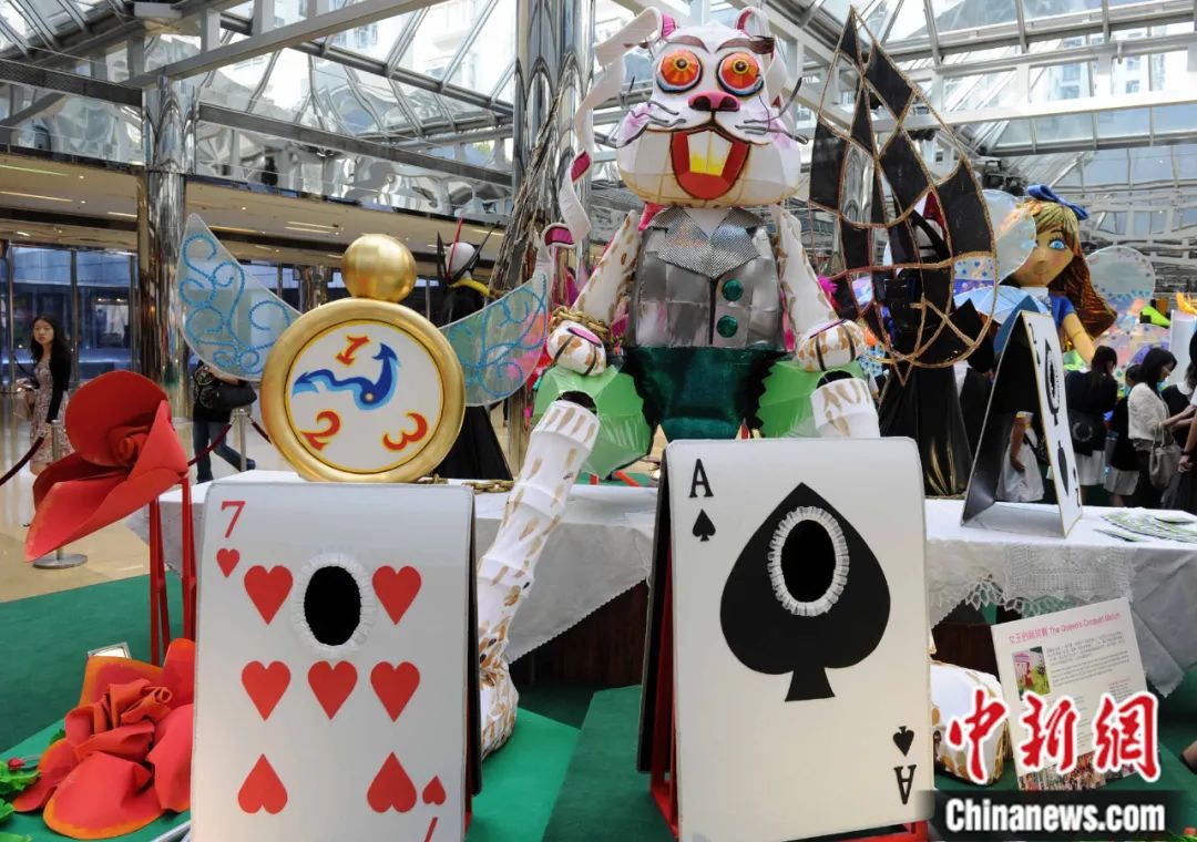 以西方著名兒童文學(xué)作品《愛麗絲夢(mèng)游仙境》為藍(lán)本創(chuàng)作了巨型木偶及巡游藝術(shù)品在香港太古城中心亮相。中新社記者 任海霞 攝