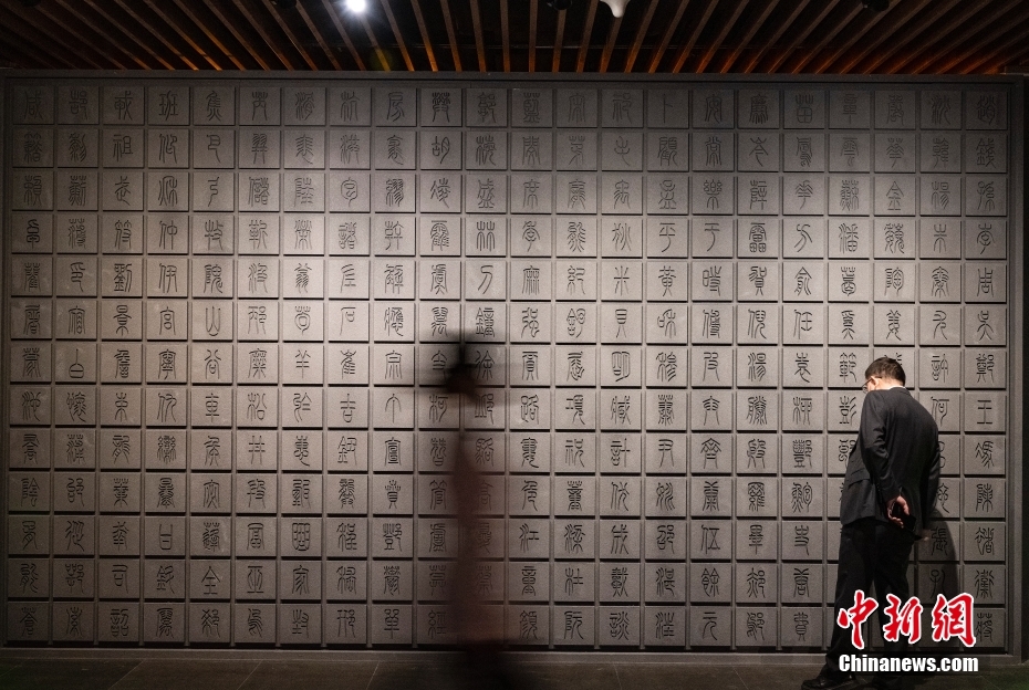 圖為“居延漢簡(jiǎn)”展區(qū)內(nèi)的漢簡(jiǎn)字形“百家姓”展墻。 中新社記者 侯宇 攝