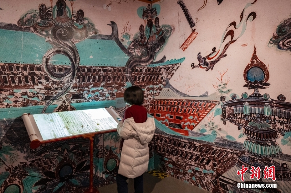 圖為觀眾在“敦煌遺書(shū)”展區(qū)內(nèi)的沉浸式體驗(yàn)區(qū)參觀。 中新社記者 侯宇 攝