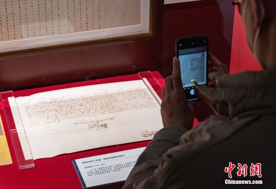 圖為“明清檔案”展區(qū)內(nèi)展示的“葡萄牙國(guó)王若瑟一世致清乾隆帝國(guó)書(shū)”展品吸引觀眾用手機(jī)記錄。 中新社記者 侯宇 攝