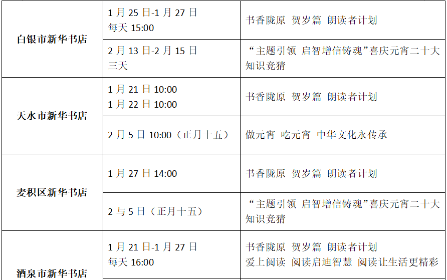 收藏!甘肅省各地新華書店春節(jié)期間活動(dòng)來了(附表)
