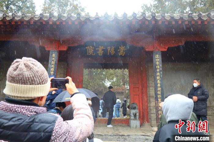 中新網(wǎng)鄭州2月23日電 (王迪)春雪依依,古柏森森,紅墻青瓦間傳出幾句儒家經(jīng)典的吟誦之聲……在22日的“寫意中國(guó)——探訪漢字起源”主題宣傳采訪中,記者探訪了河南登封市區(qū)北約二公里處嵩山南麓的嵩陽(yáng)書院。是日清晨,登封忽降細(xì)雪,映襯得整個(gè)嵩陽(yáng)書院愈發(fā)肅穆。美景難得,引得游人紛紛駐足欣賞,拍照留念。