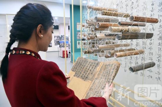 3月14日,敦煌研究院敦煌文獻(xiàn)研究所所長(zhǎng)趙曉星接受中新社記者專(zhuān)訪介紹稱,全彩印《敦煌文獻(xiàn)全集》出版工作已正式啟動(dòng),該叢書(shū)采用全彩印的方式刊布敦煌文獻(xiàn),實(shí)現(xiàn)敦煌文獻(xiàn)在線下圖錄中的高清還原。敦煌文獻(xiàn),又稱敦煌遺書(shū),是指1900年在甘肅敦煌莫高窟藏經(jīng)洞發(fā)現(xiàn)的公元4世紀(jì)至11世紀(jì)的寫(xiě)本、印本和拓片等文獻(xiàn)。據(jù)最新統(tǒng)計(jì)顯示,其總數(shù)近7萬(wàn)件。目前這些文獻(xiàn)分藏于中、英、法、俄、日等國(guó)的數(shù)十家收藏機(jī)構(gòu),一直缺乏完整的聯(lián)合目錄。圖為3月3日,工作人員在敦煌藝術(shù)館卷軸墻前閱覽敦煌遺書(shū)影印品。 中新社記者 九美旦增 攝