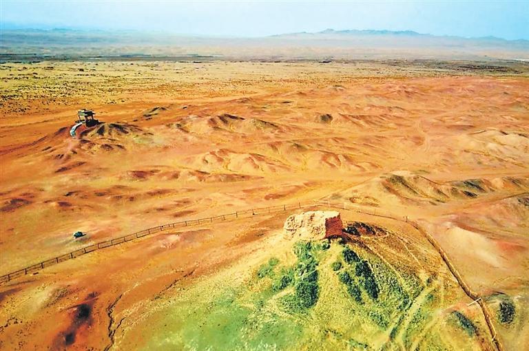 “勸君更盡一杯酒,西出陽關無故人。”王維擔心,友人過了陽關,就進入另一片天地,在那里,連折柳送友都很難辦到。陽關,離玉門關不遠,在古人看來,這里也是春風不度之地,然而,陽關在歷史上是繁華過的,曾經(jīng)車水馬龍,著名的陽關大道至今留有往日喧騰的車轍。周而復的小說《上海的早晨》里有一句話“你走你的陽關道,我走我的獨木橋”,后來成為百姓口頭俗語,可見“陽關大道”之盛名。我們去陽關走訪的那一天,風和日麗,長空中有幾片白云在飄。一只金色的蒼鷹在孤獨地盤旋。而那聳立的陽關烽燧,仍站在沙海里,守護著這座關隘,令人動容。