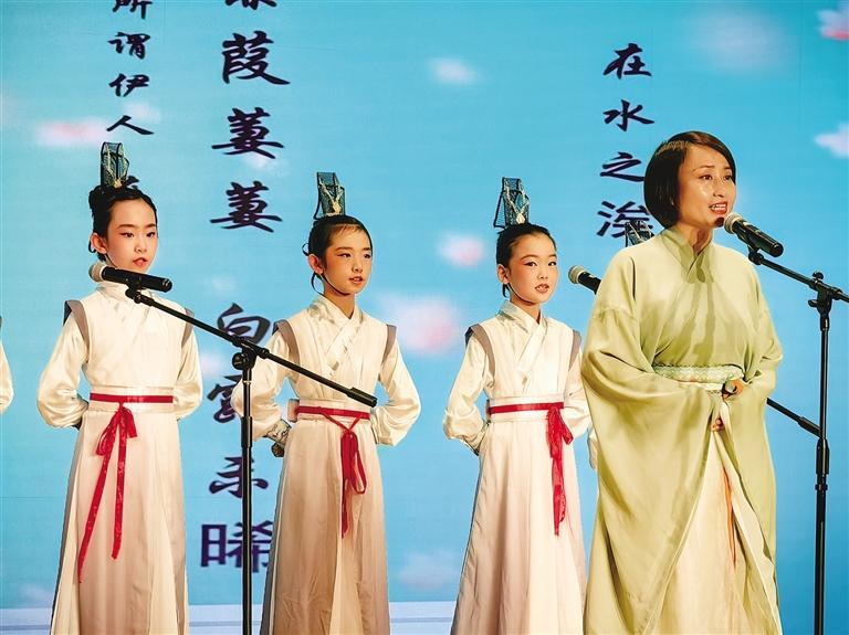 在《壯美山河絢麗詩篇》中,《詩經(jīng)·秦風(fēng)·蒹葭》在蘭州市東郊學(xué)校曹林老師和方培丞等12位小朋友的演繹下,古風(fēng)古韻氣息撲面而來。