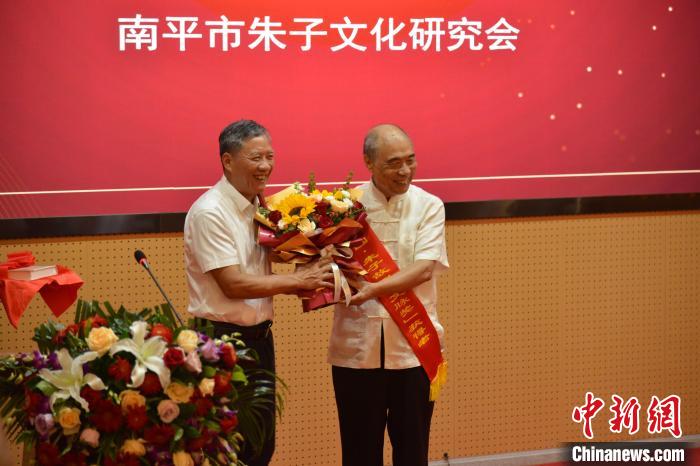 圖為第五屆“文脈獎”授予武夷文化研究院名譽院長吳邦才(右)?!∪~國寶 攝