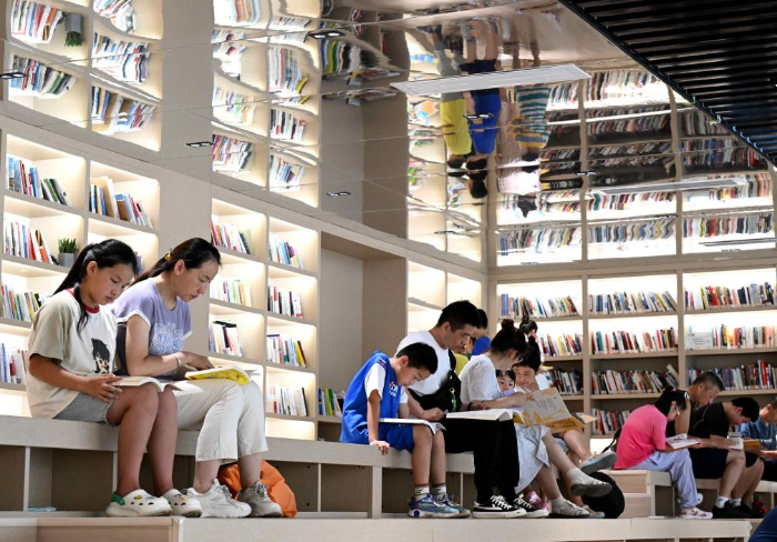 8月9日,市民在河北省石家莊市鹿泉區(qū)龍泉湖公園內(nèi)一處公園書房閱讀。