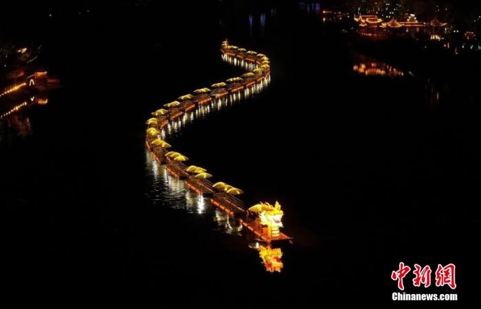 資料圖:一條200米長的水上金龍在安徽省黃山市休寧縣齊云山鎮(zhèn)橫江江面上游弋而過,龍燈迤邐,與江畔的古民居夜色相映成輝,喜迎新春。施亞磊 攝