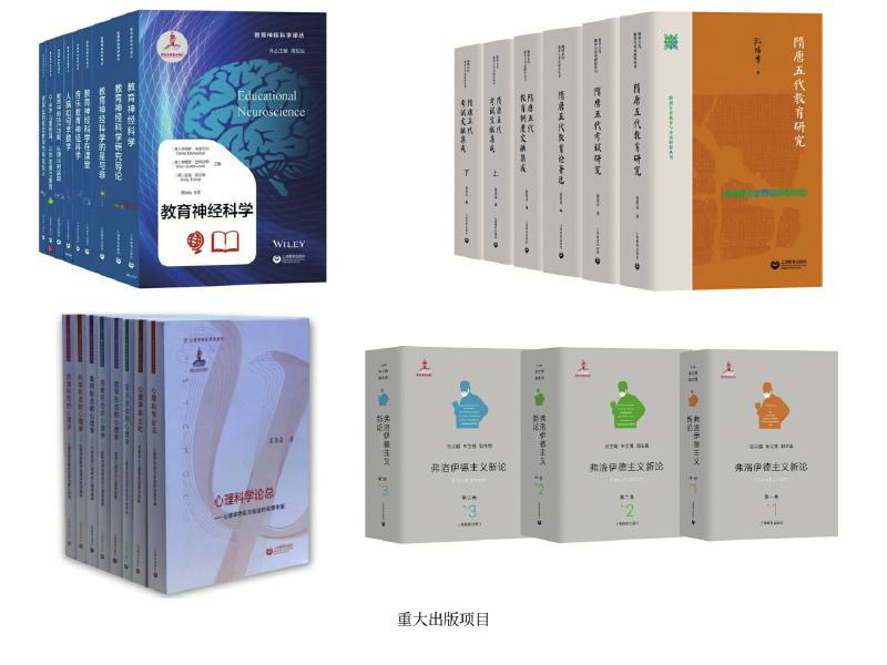 上教社密切關(guān)注新時(shí)代教育發(fā)展的重大理論問題與現(xiàn)實(shí)問題,響應(yīng)國家教育發(fā)展戰(zhàn)略需求,精心布局學(xué)術(shù)專業(yè)出版“大項(xiàng)目”,連續(xù)入選國家重點(diǎn)出版物出版規(guī)劃、2013—2025年國家辭書編纂出版規(guī)劃,獲國家出版基金資助。這其中除前文中的大型??乒ぞ邥€包括一系列教育與心理學(xué)原創(chuàng)研究和前沿研究成果:由中國教育史學(xué)者孫培青編著的“隋唐五代教育與考試研究叢書”,構(gòu)建了反映隋唐五代教育與考試全貌的教育理論體系和文獻(xiàn)資料體系,是中國教育史學(xué)科建設(shè)的一項(xiàng)學(xué)術(shù)文化積累工程;《中國課程史》以現(xiàn)代課程理論為分析框架,以歷史線索展現(xiàn)中國學(xué)校課程的新陳代謝;“教育神經(jīng)科學(xué)譯叢”(9冊(cè))是我國首個(gè)聚焦教育神經(jīng)科學(xué)這一國際教育研究前沿領(lǐng)域的學(xué)術(shù)譯介系列;《中國傳統(tǒng)德育心理學(xué)思想新論》系統(tǒng)挖掘整理中華優(yōu)秀傳統(tǒng)文化中蘊(yùn)含的德育心理學(xué)思想,構(gòu)建中國特色心理學(xué)話語體系;我國第一套以大心理學(xué)觀,從本土心理學(xué)視角系統(tǒng)探索和解讀不同形態(tài)心理學(xué)的學(xué)術(shù)系列“心理學(xué)形態(tài)研究系列”(6冊(cè)),全景考察心理學(xué)的命運(yùn)與前途,深入探索中國本土心理學(xué)的選擇與突破;《弗洛伊德主義新論》(三卷)匯聚國內(nèi)弗洛伊德主義研究領(lǐng)域的權(quán)威學(xué)者,歷史展現(xiàn)弗洛伊德理論的百年發(fā)展歷程,提供弗洛伊德主義研究的“全景圖”。這些重大出版項(xiàng)目為構(gòu)建中國特色自主知識(shí)體系,建設(shè)中國教育學(xué)和心理學(xué)學(xué)科體系、學(xué)術(shù)體系、話語體系發(fā)揮了重要作用。