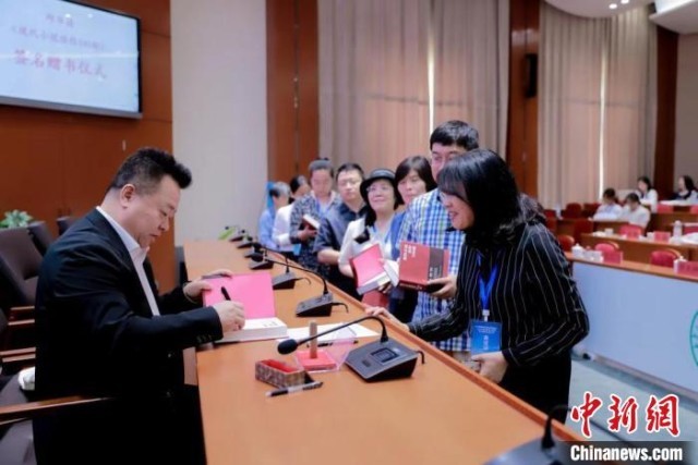 圖為邱華棟向部分參會代表進行現(xiàn)場簽名贈書?!让晒艓煼洞髮W供圖