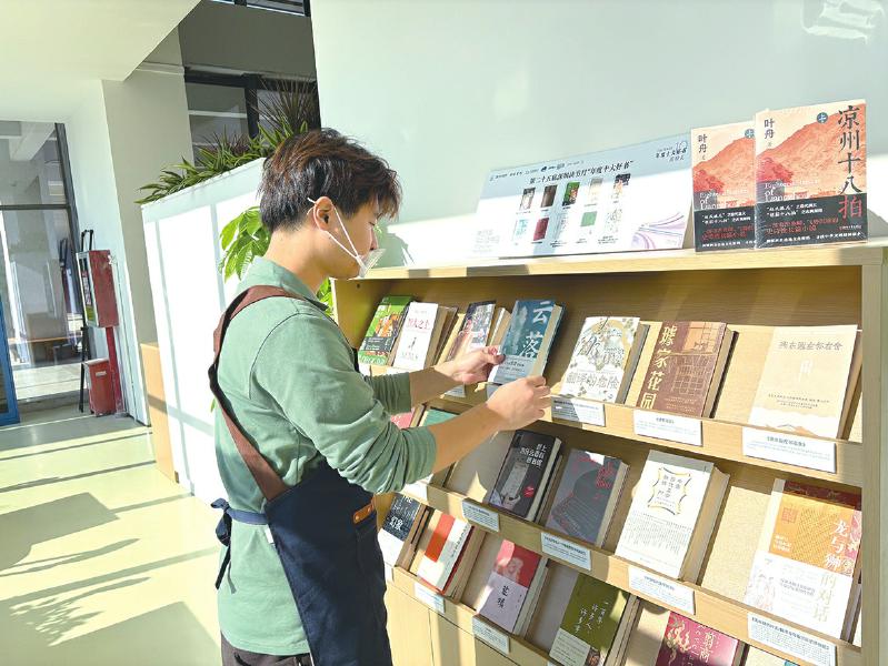1月1日上午,深圳信息職業(yè)技術(shù)學(xué)院湖畔書吧店長(zhǎng)蔡錦元在整理書架、碼放圖書。