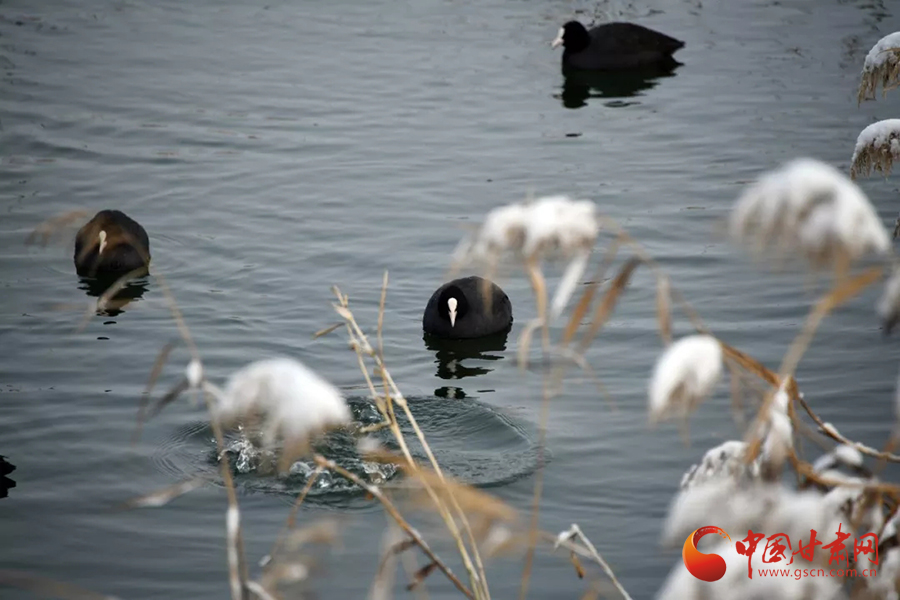 黑白相間的珍禽點(diǎn)綴尚未結(jié)冰的湖面