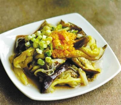 將茄子洗凈削皮,切成塊,放入蒸鍋蒸大約15分鐘,放盤中晾涼待用。大蒜剝皮,剁成蓉,放入碗中,加入醬油、香油、精鹽、味精拌勻。將調(diào)味汁倒在茄子上拌勻即可。
