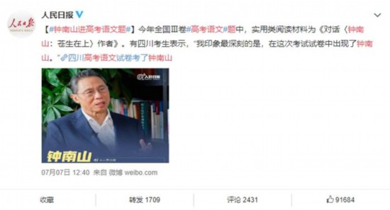 近日,“鐘南山進(jìn)高考語文題”登上熱搜。據(jù)媒體報道,今年全國Ⅲ卷高考語文題中,實用類閱讀材料為《對話〈鐘南山:蒼生在上〉作者》。